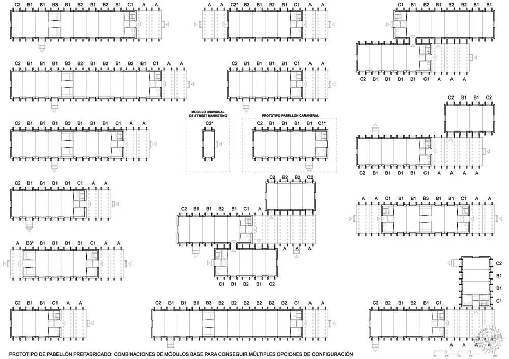 這是一個靈活重配置的工業體系。預制展館原型基于標準模塊的多種形式,是靈活多變的體系。這種模塊化附加類型項目可以根據不同的項目需求進行配置,其中包括大型博物館大廳和小規模辦公室等多種組合。