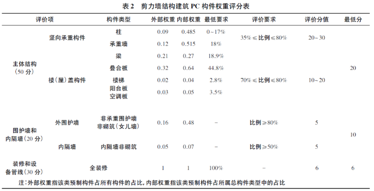 鑒于剪力墻結(jié)構(gòu)在我國(guó)的普及性,本文以裝配式剪力墻結(jié)構(gòu)體系為研究對(duì)象,通過對(duì)我國(guó)11項(xiàng)代表性裝配式建筑工程的統(tǒng)計(jì)分析,得出裝配式建筑剪力墻結(jié)構(gòu)的外部權(quán)重和內(nèi)部權(quán)重,以及評(píng)級(jí)標(biāo)準(zhǔn)規(guī)定的單項(xiàng)構(gòu)件預(yù)制率的最低要求,結(jié)合《標(biāo)準(zhǔn)》評(píng)分表,剪力墻結(jié)構(gòu)預(yù)制構(gòu)件率最低要求和相應(yīng)權(quán)重如表2所示。