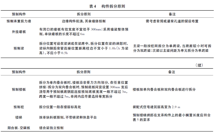 裝配式建筑構(gòu)件拆分是設(shè)計(jì)的關(guān)鍵環(huán)節(jié),根據(jù)《預(yù)制預(yù)應(yīng)力混凝土裝配式整體式框架結(jié)構(gòu)技術(shù)規(guī)程》JGJ224-2010和相關(guān)文獻(xiàn)中的規(guī)定,對(duì)構(gòu)件的拆分一般遵循“少規(guī)格、多組合”的原則,具體規(guī)定見表4。