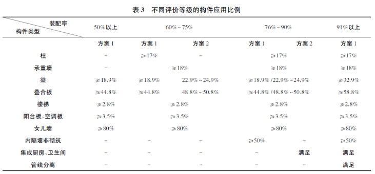 此外,通過統(tǒng)計(jì)分析,得到不同評(píng)價(jià)等級(jí)對(duì)應(yīng)的構(gòu)件應(yīng)用比例(如表3) ,因預(yù)制構(gòu)件中梁、板對(duì)裝配率影響最大,所以裝配率的變化主要以調(diào)整梁、板應(yīng)用比例為主