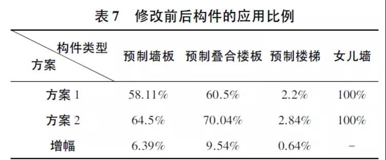 上文計(jì)算出的裝配率未達(dá)到目標(biāo),可將裝配率調(diào)整為78%,BIM會(huì)按照構(gòu)件權(quán)重比例更改構(gòu)件應(yīng)用比例,從而根據(jù)應(yīng)用比例的變化,更改方案設(shè)計(jì)。項(xiàng)目修改裝配率后,各構(gòu)件應(yīng)用比例如表7所示。