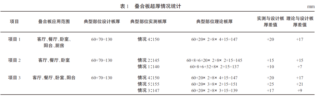 上述3個項目調(diào)研結(jié)果中,疊合板應(yīng)用范圍、典型部位設(shè)計板厚、典型部位實測板厚、典型部位理論板厚、實測與設(shè)計板厚差值、理論與設(shè)計板厚差值如表1所示。由表1可知,疊合板實測板厚>理論板厚>設(shè)計板厚。