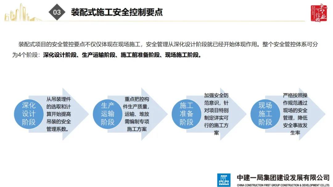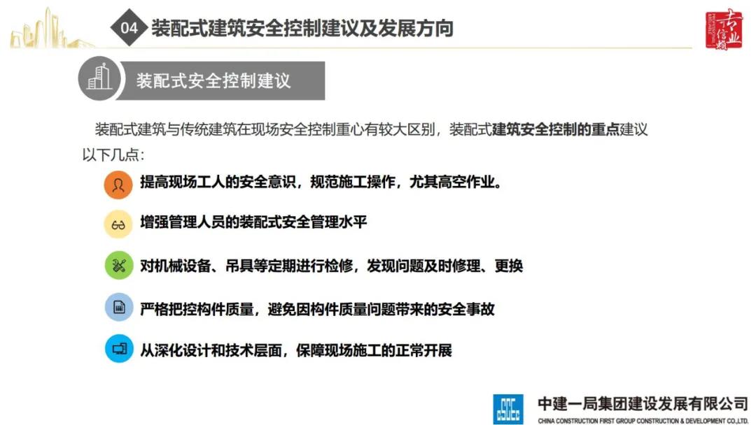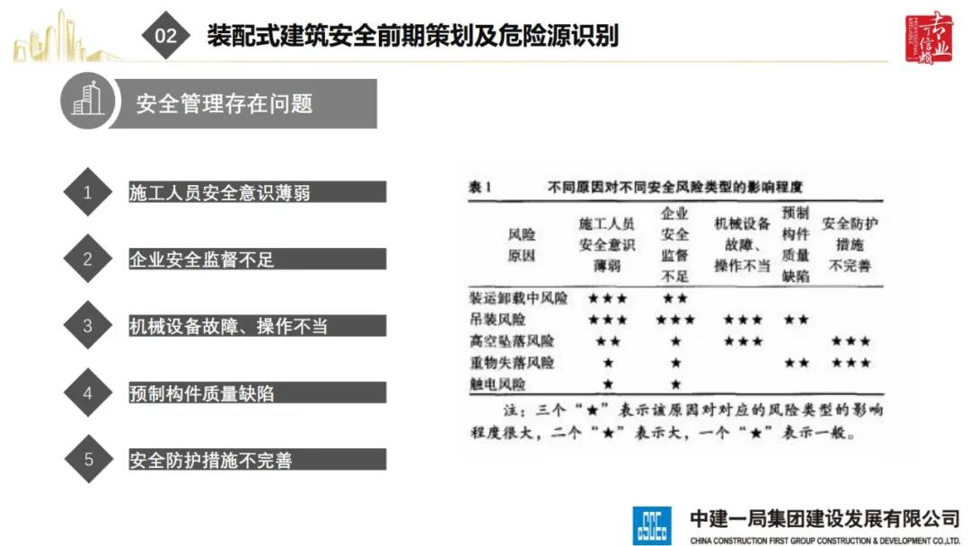 2020年8月28日,“2020全國重大工程安全管理創新與事故防范經驗交流會”在北京召開。中建一局集團建設發展有限公司副總經理李浩做“裝配式建筑施工安全風險控制及事故防范措施”的報告。通過分析裝配式建筑安全事故典型案例,從深化設計、生產運輸、施工前準備、現場施工4個階段提出安全控制要點;指出安全前期策劃和危險源識別的重要性;最后,提出裝配式建筑安全控制建議及發展方向。
